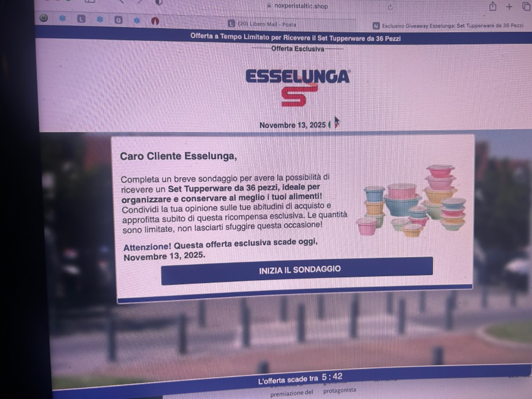 Solito trucco per carpire i vostri dati. Una finta Esselunga si affaccia nelle vostre mail e vi chiede di partecipare a un sondaggio. Ma attenzione, avete solo cinque minuti. Tranquilli, il tempo poi non scade e, naturalmente, il sondaggio è a dir poco ridicolo. Tutto questo per farvi vincere uno spettacolare set di ciotole di tutte le dimensioni.
