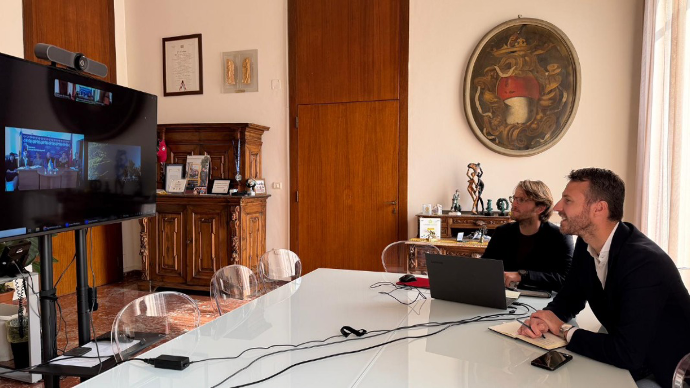 Il sindaco Gennadiy Sumskiy, intervenuto in videoconferenza con la bandiera ucraina ed europea, ha voluto esprimere a nome dell’intera cittadinanza di Tsarychanka la propria gratitudine: