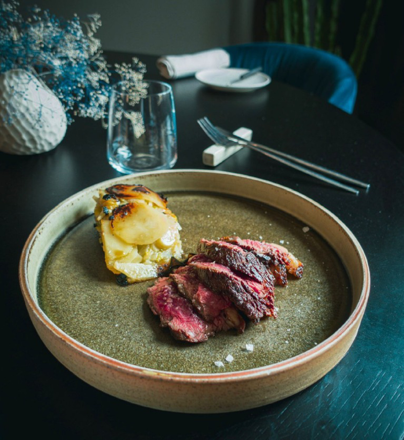 Interessante anche la proposta vegetariana con piatti curiosi e delicati: ravioli ripieni di Roccaverano, Presidio Slow food, e asparagi e un vegan steak con crema di patate e funghi.