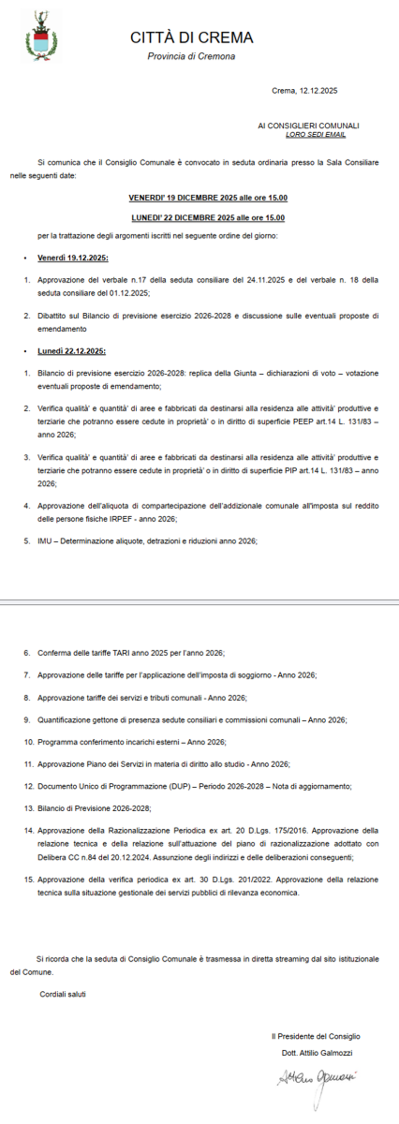 Il Comune di Crema terrà una seduta dedicata all’approvazione del bilancio di previsione 2026-2028 e alle principali decisioni su tributi, tariffe e servizi comunali. L’incontro sarà trasmesso in diretta streaming sul sito ufficiale del Comune.