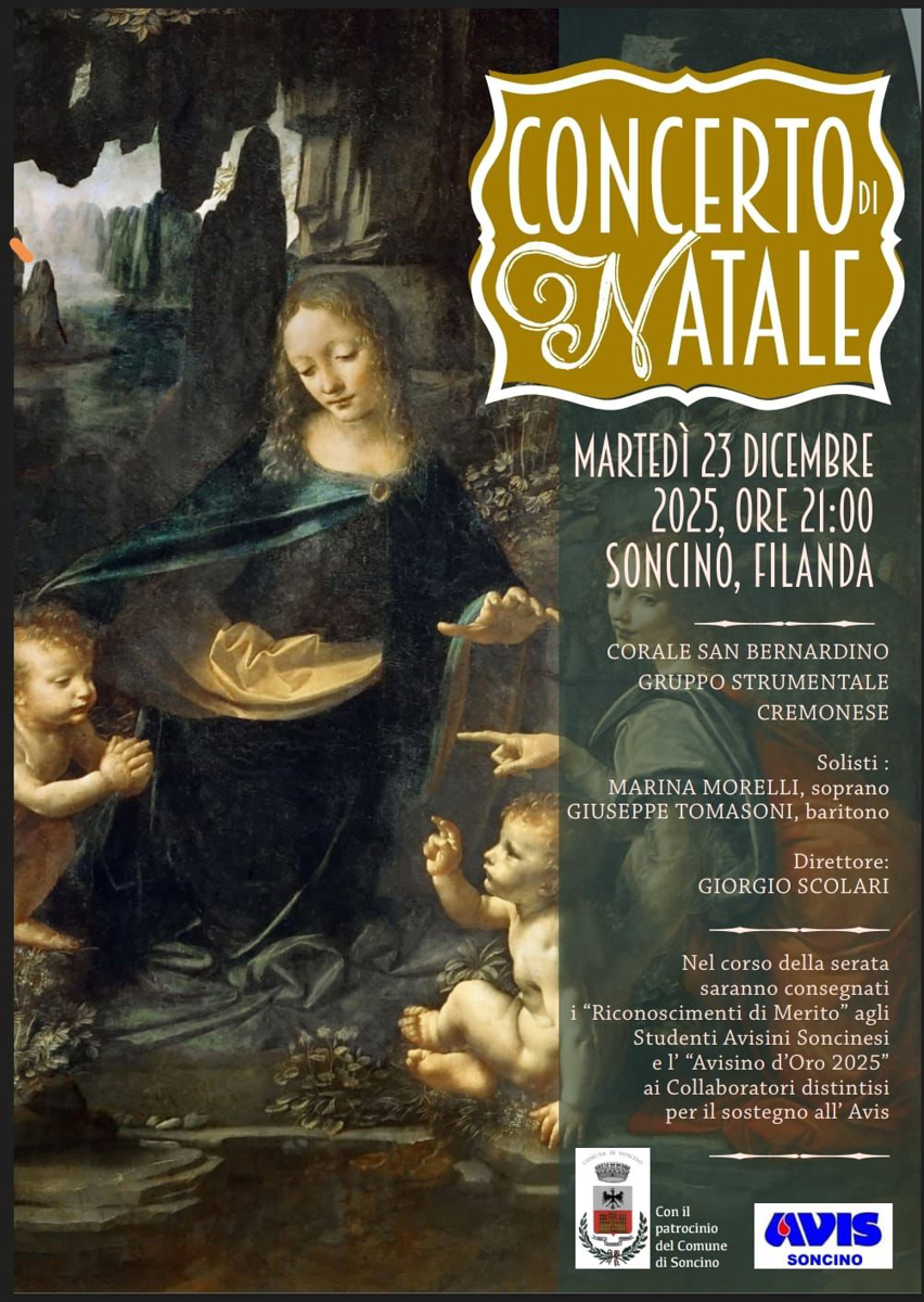 Concerto con Corale San Bernardino e Gruppo Strumentale Cremonese. Solisti Marina Morelli soprano e Giuseppe Tomasoni baritono. Direttore Giorgio Scolari. Durante la serata consegna dei Riconoscimenti di Merito agli studenti avisini soncinesi e dell’Avisino d’Oro 2025 ai collaboratori distintisi per il sostegno all’Avis.
