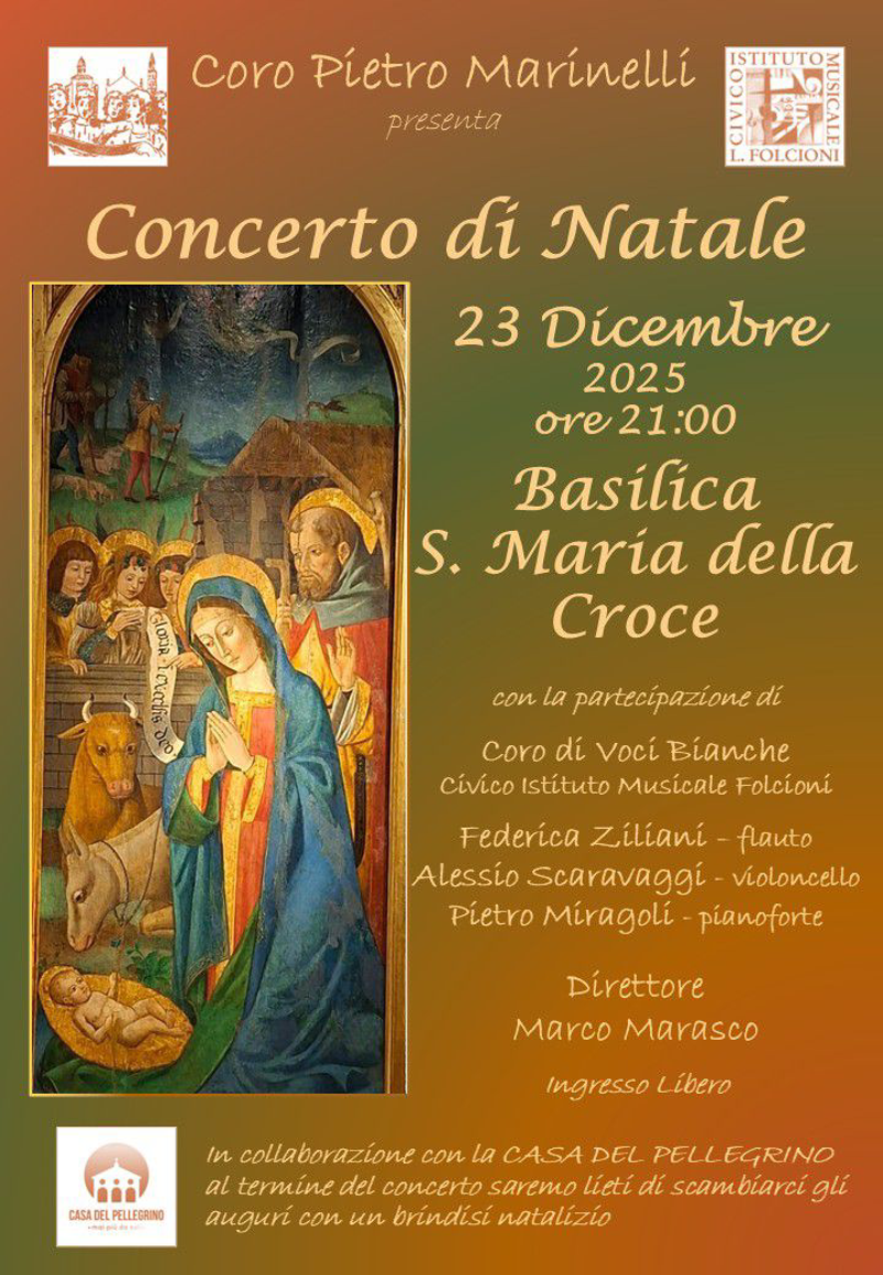 Concerto del Coro Pietro Marinelli con la partecipazione del Coro di Voci Bianche del Civico Istituto Musicale Folcioni. Solisti Federica Ziliani flauto, Alessio Scaravaggi violoncello, Pietro Miragoli pianoforte. Direttore Marco Marasco. In collaborazione con la Casa del Pellegrino brindisi natalizio al termine.