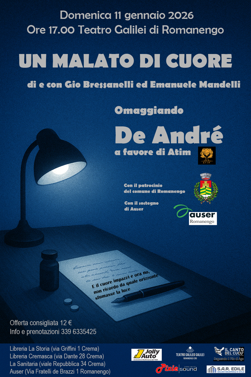 Spettacolo di e con Gio Bressanelli ed Emanuele Mandelli, omaggio a De André a favore di Atim.