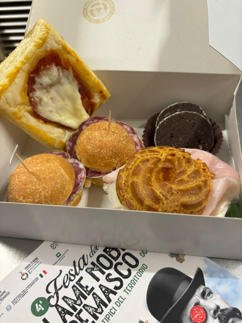 Partiamo dall’idea originale della Pastry chef Elisa Tomasini, della pasticceria Dolci Torte (piazza Marconi) che ha pensato a un kit aperitivo invitante e goloso, tutto homemade: un panino all’olio con il salame, una zeppola farcita con prosciutto cotto, Raspadura lodigiana e insalata, una pizzetta di sfoglia e qualche fetta di salame dolce.