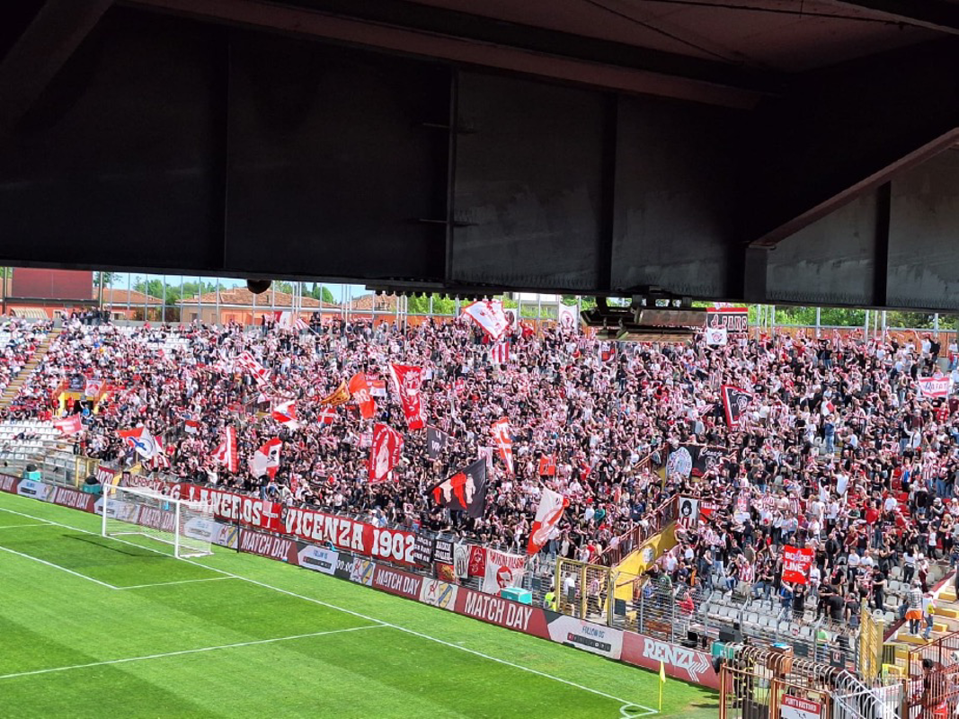 Per il confronto con il già promosso Vicenza, mister Tacchinardi deve rinunciare allo squalificato difensore Lambrughi e agli infortunati Aidoo, Dore, Pala e Pessolani. La formazione è quella annunciata, con il rientro di Bane a destra della retroguardia e il debutto da titolare di Meconi. In casa del Vicenza, l’allenatore Fabio Gallo concede la passerella ad alcuni elementi tra i meno utilizzati nel corso della stagione, riducendo così il gap tecnico tra le due squadre. La partenza è dei locali, che nel giro di cinque minuti mettono due volte i brividi alla difesa ospite. Il Pergo ci mette un po’ a prendere le misure e al 19’ è il secondo assistente a salvarlo sul colpo di testa vincente di Cappelletti, annullato per posizione irregolare. Il resto della prima frazione non regala altre emozioni, se non un’incornata di Corti che manda la sfera di poco alto. Si va al riposo a reti bianche. L’avvio di ripresa è ancora di marca locale, senonché al quarto d’ora Talarico protesta dopo un’ammonizione e si guadagna la doccia anticipata. Dopo alcuni minuti, Gallo ridisegna la sua formazione operando quattro sostituzioni in contemporanea. Nonostante la superiorità numerica, il Pergo non riesce a uscire dalla propria metà campo. La panchina cremasca prova allora a inserire forze fresche, con Padalino e Orlandi al posto del positivo Roversi e dello spento Petrovic. Neanche i successivi ingressi di Jaouhari e Catena riescono a rivitalizzare i gialloblù, che al 34’ rischiano grosso su un tiro di Vescovi deviato a fil di palo. La Pergolettese sembra volersi accontentare del pareggio e evita di sbilanciarsi. Nel recupero, Orlandi cade in area dopo un contatto con Rada, ma l’arbitro prima concede il penalty e poi ci ripensa dopo il controllo all’Fvs. Nello stesso istante termina la partita di Verona, con il pareggio che decreta la salvezza matematica dei gialloblù. E’ festa doppia, con i biancorossi e i gialloblù a saltare sotto le rispettive curve.